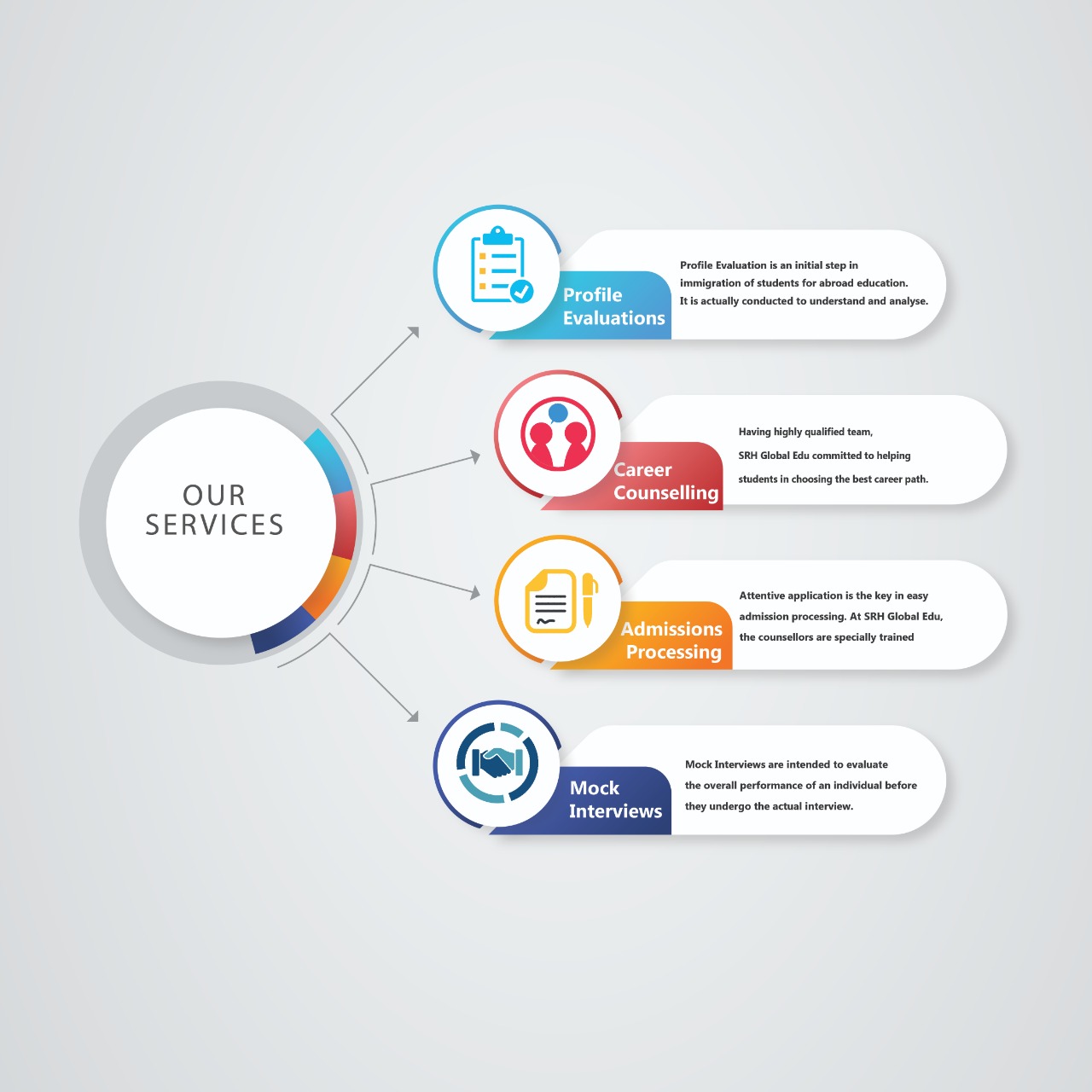 Being an experienced and expertise abroad consultants, Ms. Renu Pandey and Mr. Hari Krishna formulated the procedure of guiding the students on Profile Evaluations, Career counselling, Admissions Processing, Training for IELTS/PTE, Mock Interviews and many more.